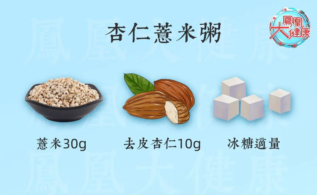 【用料】薏米30g,去皮杏仁10g,冰糖适量。