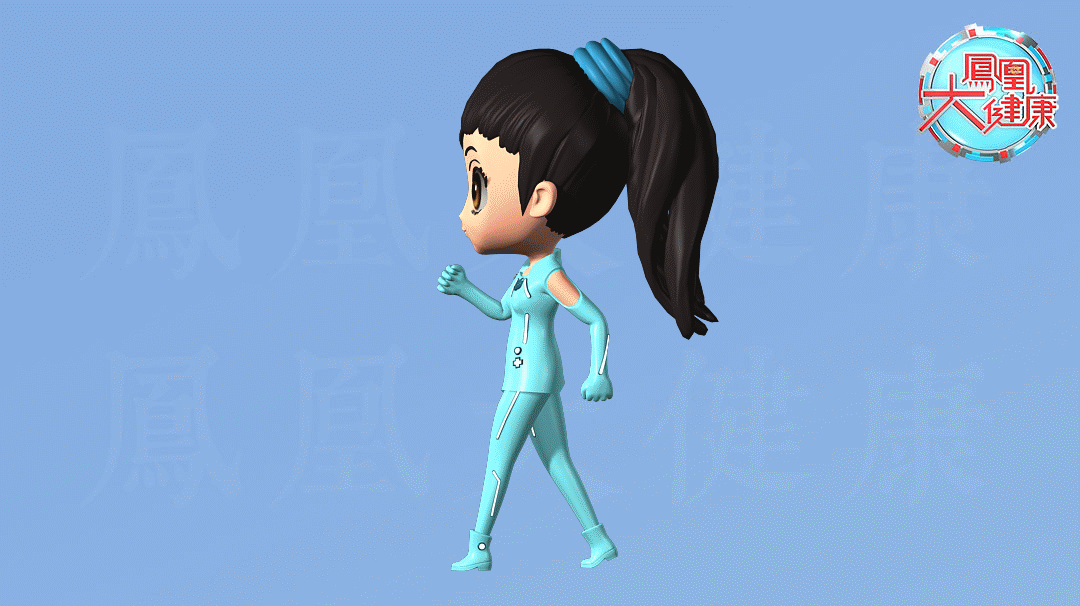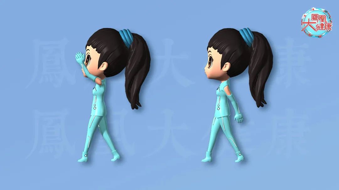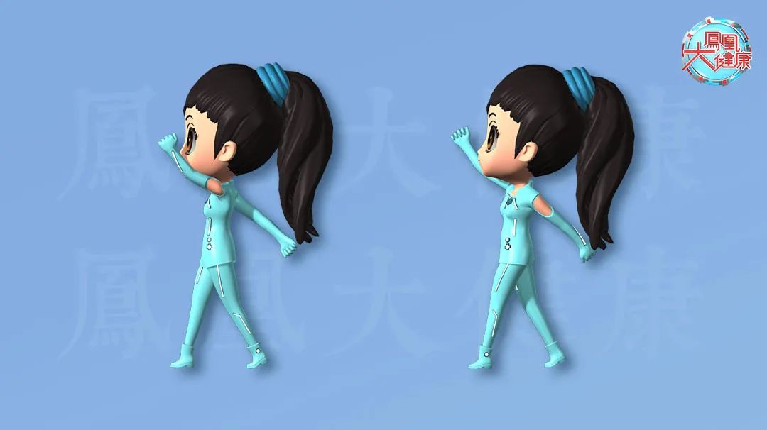 【双臂舞动】:双臂要主动舞动。舞动双臂使凹凸臂呈约90度,有节律地摆到胯后,朝上则摆到与肩同高。